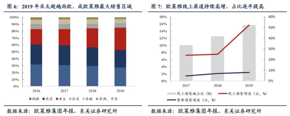 完美日记伴随Z世代、国货潮流兴起,偏营销型打法。历经4年发展成功上市,市场份额主要归功国内。欧莱雅历经百余年发展,以研发为主,已遍布150多个国家,拥有36个品牌。在2019年,亚太地区成为欧莱雅市场份额最大地区。