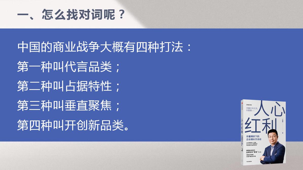 我在《人心红利:存量博弈下的企业增长方法论》这本书里讲了占领消费者心智,成为消费者心智中的首选有两个方法:找对词,进心智。