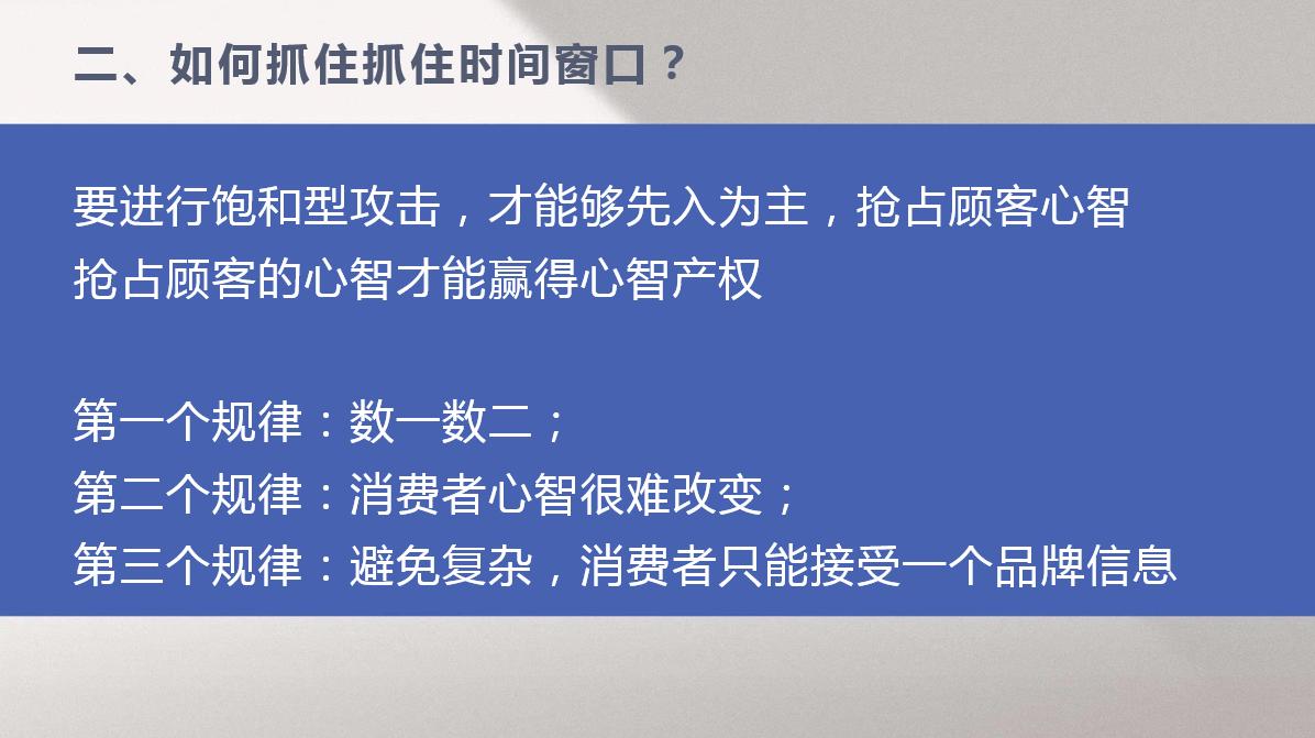 抓住时间窗口,进行饱和攻击,才能够先入为主,抢占顾客心智,才能够赢得心智产权,成为优先选择。