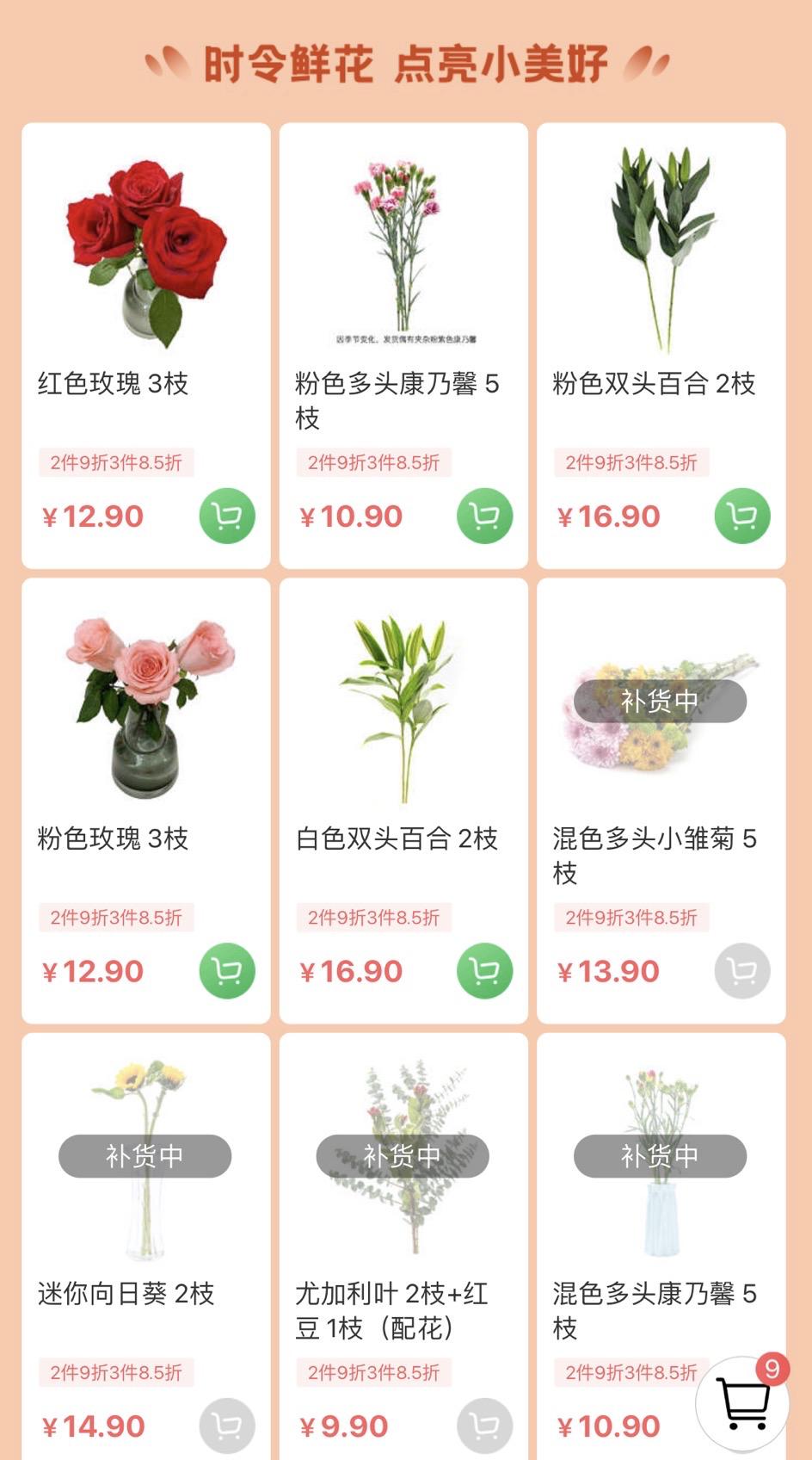 以叮咚买菜北京地区为例,在鲜花类目下,已有十多个SKU,很多热门的鲜花品种,还要靠抢,一上架就售罄。