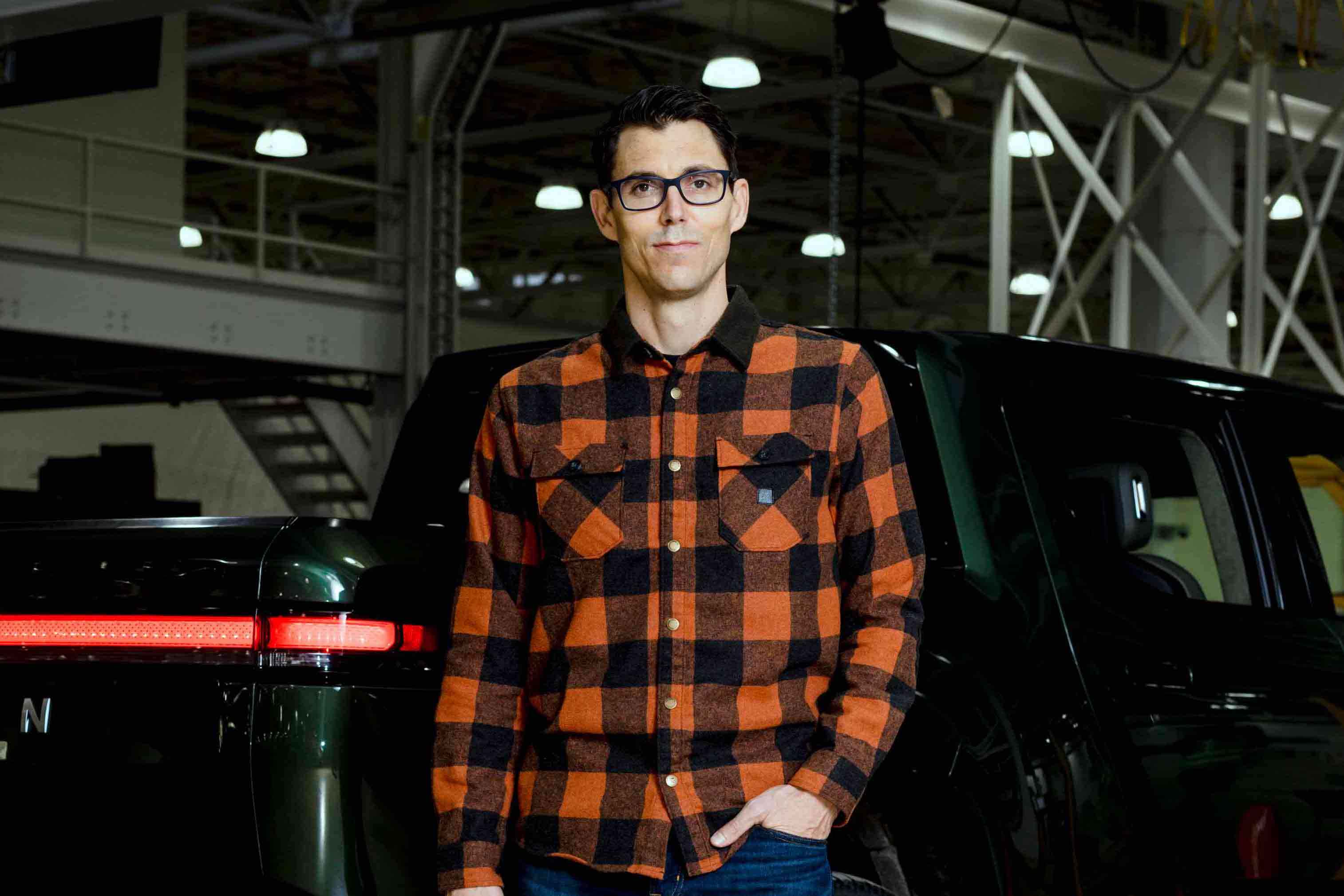 Rivian创始人兼首席执行官斯卡林(RJ Scaringe),在伊利诺伊州的Rivian工厂里工作。他是一位工程师,曾希望用骑自行车、徒步、洗冷水澡和手洗衣服的方式降低碳排放。图片来自《纽约时报》,摄影Lyndon French
