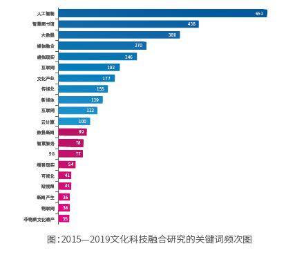 由共现图和词频图可知,人工智能是学界最为关注的关键词,其次依次为智慧图书馆、媒体融合、虚拟现实。同时,通过对节点的颜色渐变趋势来看,人工智能、大数据、虚拟现实、云计算、5G等技术是近五年以来学界较为关注的技术方向,文化产业和传媒业则是学者最为关注的两个主要领域,智慧图书馆、媒介融合、大数据应用场景是学者所关注的三大融合趋势。