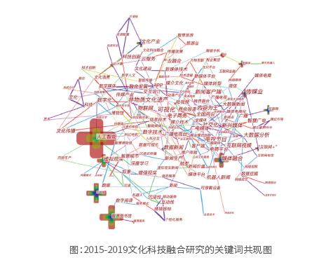 文化科技融合领域已经是近年来学术研究的热点领域,基于对中文文献的检索,项目组通过绘制关键词共现图、关键词词频图和关键词时区图呈现近五年来学界关注的文化科技融合版图。