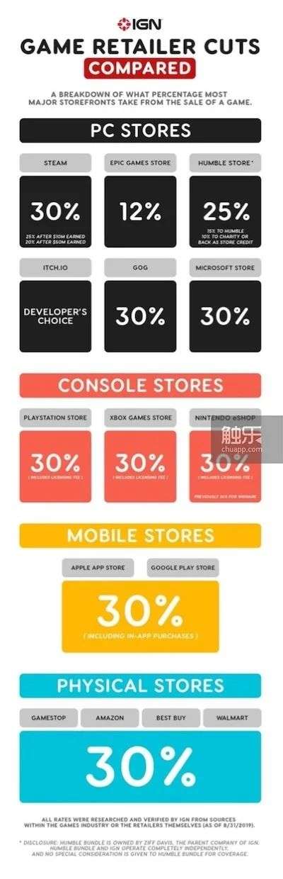 30%的平台抽成不只是苹果和谷歌的问题,而是多年的业界惯例。IGN在2019年进行过统计,除了主流PC游戏、主机游戏、手机应用等线上销售平台,一些大型实体店的分成也是30%。