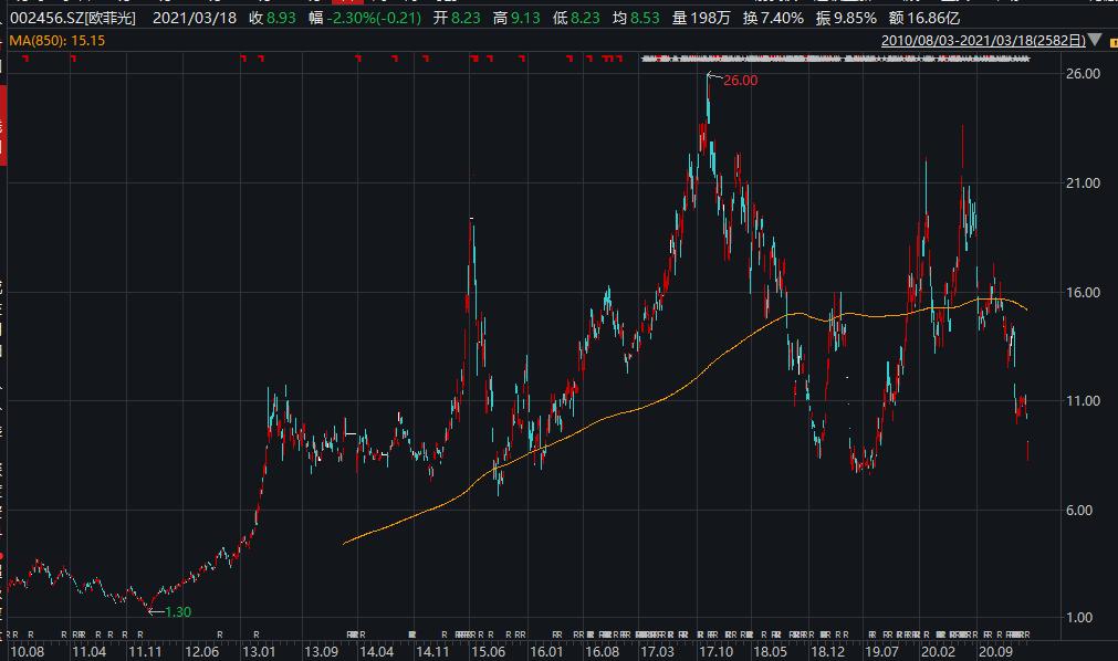 2020年7月,欧菲光被美国列入“实体清单”,9月市场上就有传闻称,欧菲光将被踢出苹果产业链。尽管公司多次否认,但市场早已用脚投票。截至2021年3月18日,欧菲光股价8.93元/股,较2020年7月高点23.62元/股,跌幅超过60%,市值蒸发超200亿元。
