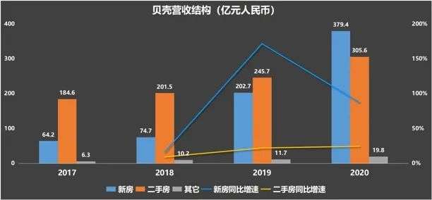独立研究公司灼识投资咨询预计,2020年中国房地产中介带动的GTV,将是二手房6.5万亿,新房3.9万亿,租房1.1万亿。而从贝壳GTV看,新房交易额出现了显著走高,且向平台贡献的营收额超越二手房,成为贝壳第一大营收支柱。在房企去杠杆改革调整后,贝壳的二手房营收增速从16.3%猛增至171.3%。