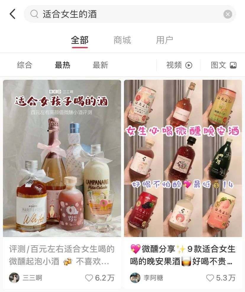 女性对美的不懈追求,驱使着越来越多的女性品牌在外包装上花费更多的功夫。目前市面上靠高颜值包装吸睛的果酒产品已经数不胜数,令人眼花缭乱。从小红书中的数据来看,关于女性酒的话题笔记多达7万+,浏览量已超1亿。其中高颜值、适合女生等标签成为搜索热点,从中便可以窥探出产品包装的重要性。