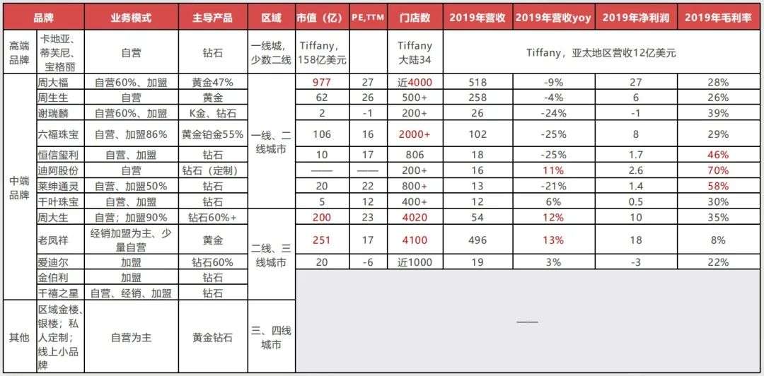 珠宝的属性是高价值可选消费,它的刚需非常依赖于营销,就像戴比尔斯成功的让人们相信了钻石等于爱情,这是一门高度依赖品牌推动的生意,品牌是这个行业最核心的要素,这也是为什么高端市场Tiffany&Co为代表的外资几乎没有对手,市值和利润表现也优于国内的品牌。