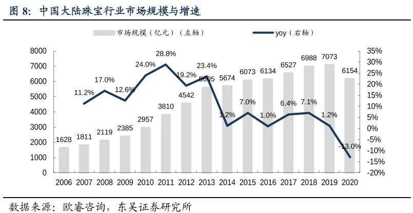 据公开资料统计,2019年珠宝行业市场规模突破7000亿元,达到7073亿元;2020年受疫情影响,珠宝主要收入来源线下门店失去春节和情人节的旺季收入,行业规模同比下降13%,但疫情只是行业下滑的黑天鹅事件,整个行业大的趋势其实早在2013年随着金价暴跌,就从爆发式增长进入了低谷的寒冬期。