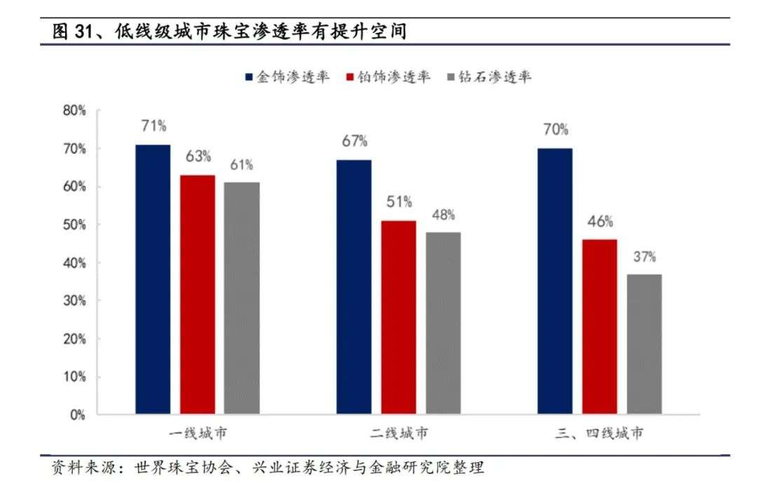 我们收集了三组数据,第一组数据世界珠宝协会,2016年一线城市新婚女性钻石购买率61%,三四线城市渗透率仅37%。一二线城市更喜欢购买铂金、钻石产品。