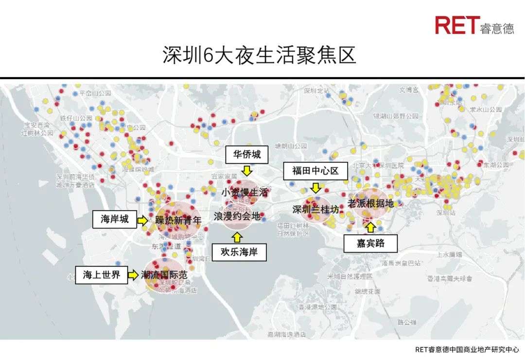 夜经济主要是在18:00至次日6:00时段消费,夜间消费是城市活力最重要指标之一。中国夜间经济发展规模呈现爆发式增长,2020年突破30万亿元。深圳在夜间消费有得天优势,宜人气候、山海相拥的自然环境,平均年龄仅32岁的四面八方打拼年轻人,他们是深圳夜经济主力军。在睿意德发布夜经济统计中,深圳已形成六个主要夜生活聚焦区(如下图),包括以酒吧、电影院、KTV、健身、夜宵、网吧、演艺、便利店等主要夜间消费内容。全国电影平均散场时间凌晨00:13分,而深圳是01:17分;城市夜间21点-凌晨2点的外卖订单占比,深圳也以13%名列“夜宵之城”榜首 。深圳未来40年应继续强化夜间消费业态,让夜间经济成为驱动未来城市发展新势力。