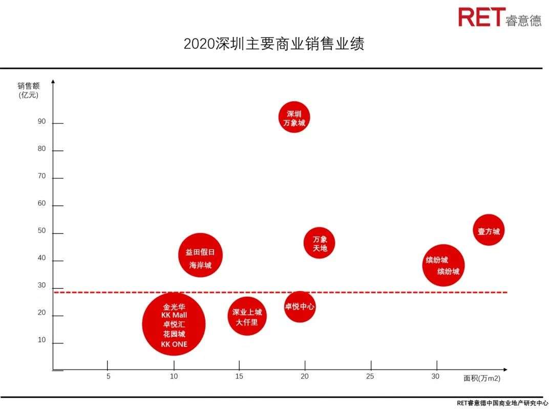 零售市场规模不足:市场规模是投资者关注城市未来商业机会的首要指标。深圳2020年社消总额为8,664亿元,低于北京、上海万亿元规模。商业项目中深圳万象城虽以90多亿销售额在全国排名前茅,但第二梯队商业项目的销售业绩仍不够突出。