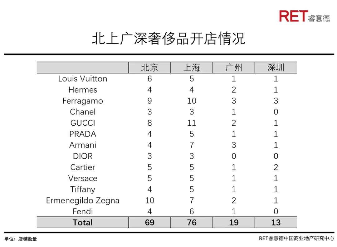 奢侈品开店数规模小:奢侈品牌开店数量是洞察一个城市商业繁荣和国际化的重要风向标。深圳作为高收入城市,在高端消费方面与城市经济地位相差甚远,一些国际一线品牌开店数量明显低于同类型城市。