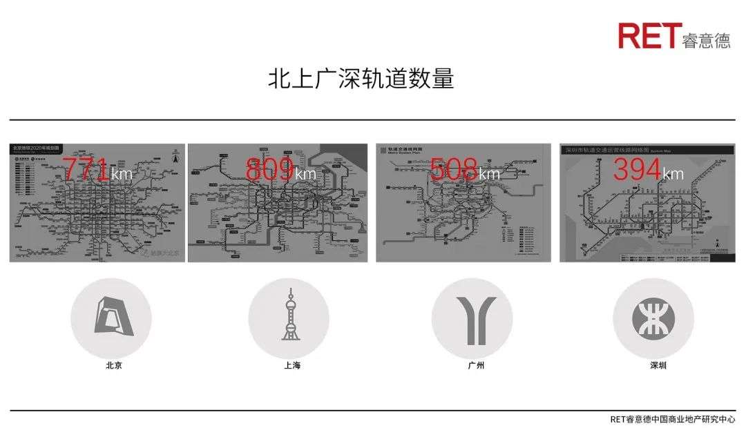 轨道里程制约商业外部拓展性:由于城市规模越来越大,居民无论找工作还是消费对轨道倚重越来越大。轨道在城市商业中扮演着重要的动脉作用,轨道延展亦为商业地产发展提供巨大拓展机会。深圳轨道总里程394公里,约为北京、上海一半,未来还有巨大发展空间。深圳地形为长条型城市,未来在纵深方面与东莞或惠州紧密联系。相当一部分深圳上班族将外溢到周边,未来轨道联络的便利性,将决定深圳商业辐射力及消费潜力。