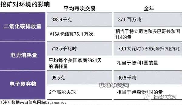 在这一过程中需要大量的计算作业,因此大量消费电力和构成计算机的电子零部件,还排放很多二氧化碳。信息网站Diginomics的统计显示,每年由于比特币“挖矿”而消耗的电力与智利整个国家的耗电量相当,电子废弃物也相当于卢森堡1个国家的量。