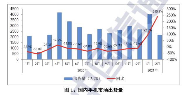 事实上,国内手机整体出货量并没有受到“缺芯”现象的影响,反而在今年迎来高速增长。据信通院数据,今年1月-2月,国内手机市场总体出货量6187.9万部,同比增长127.5%,相较11月-12月,也增长了10%。