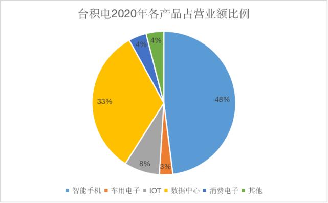 翻阅台积电2020年的财报,智能手机是其生产份额最大的产品类型,占据了48%的营业额,同比增长23%。而车用电子仅占3%,因为需求低估,去年车厂减少了7%的订单,这也为今年汽车缺芯埋下了伏笔。