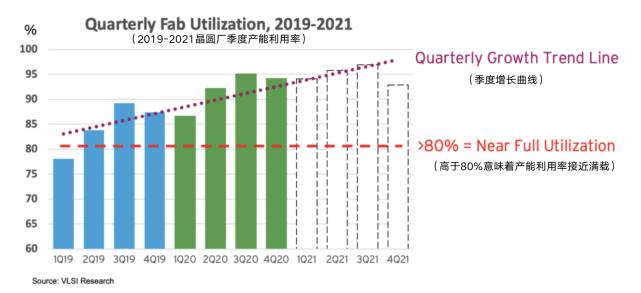 另外,美国半导体协会表示,两个因素有助于缓解芯片荒:一是,过去两年,晶圆厂的产能利用率正在稳步提升,预期今年Q2能达到95%以上,Q4将趋近于100%。