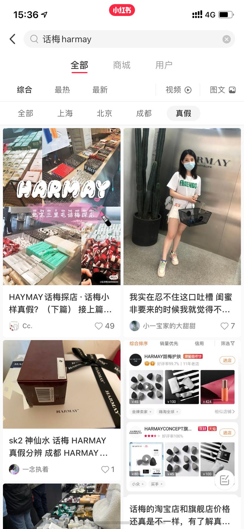 在小红书平台搜索话梅后,系统自动生成的四个分类浏览标签分别为「上海」「北京」「成都」和「真假」。由此可见真假问题已经是大众对于话梅Harmay讨论的主要议题。