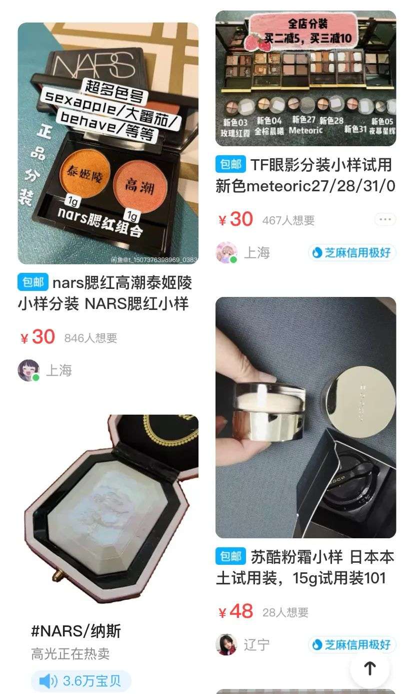 弥补小样货源供应不足而衍生出的化妆品/护肤品分装生意也曾成为后起之秀。即使国家明令禁止出售私自分装的产品,这类交易依然从淘宝转移到微店、闲鱼等更加宽松的平台,甚至于近几年在淘宝上出现反扑。由此也可窥见试用体验类商品,巨大的市场需求。