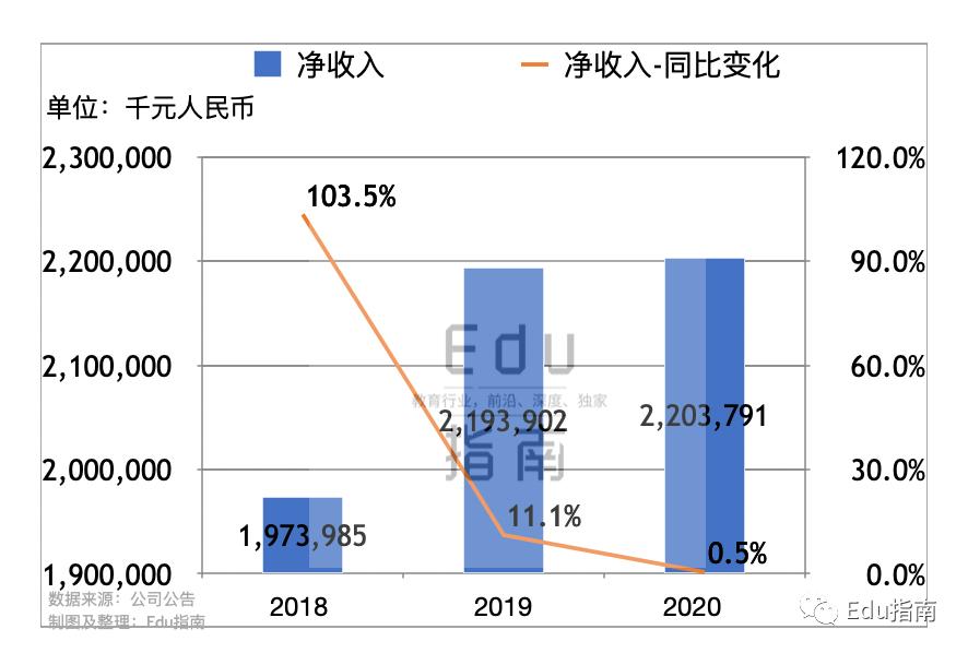 2020年总账单(一般指当年培训/课程销售额)为23.54亿元,同比2019年的23.59亿元,同比下降1%。2020年新生数据为43.4万人次。