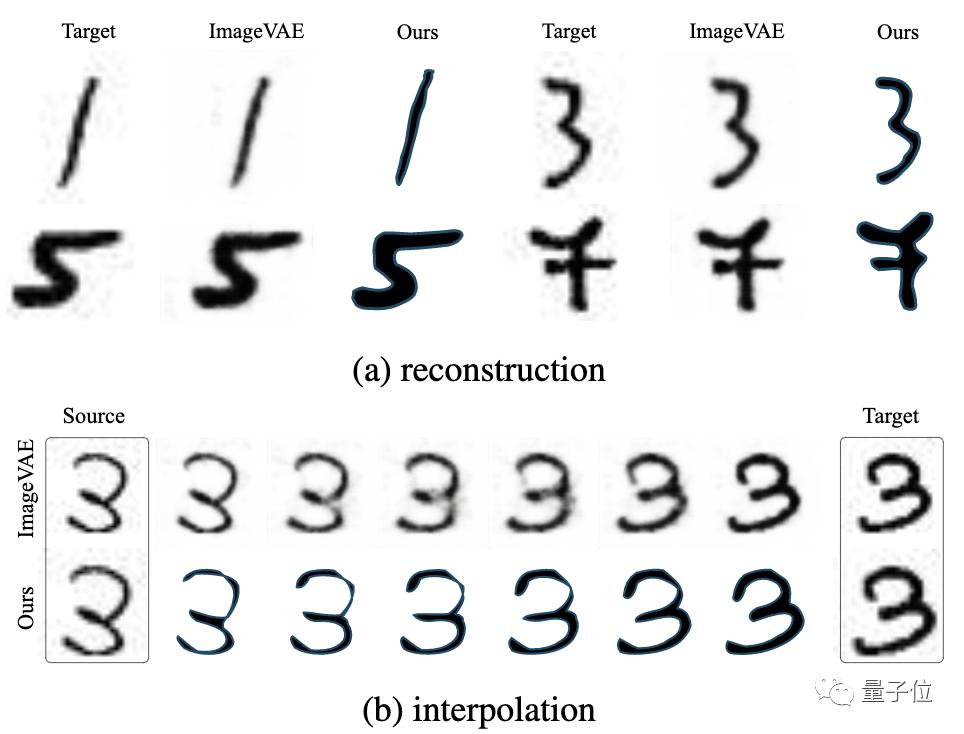 对于ImageVAE和Im2Vec,在没有数字类专门化或条件化的情况下,ImageVAE则受到低分辨率栅格图像的限制(图a),而Im2Vec能够生成矢量输出,因此具有相关的可编辑性和紧凑性优势;二者在生成插值上也都实现了较好的效果(图b)。