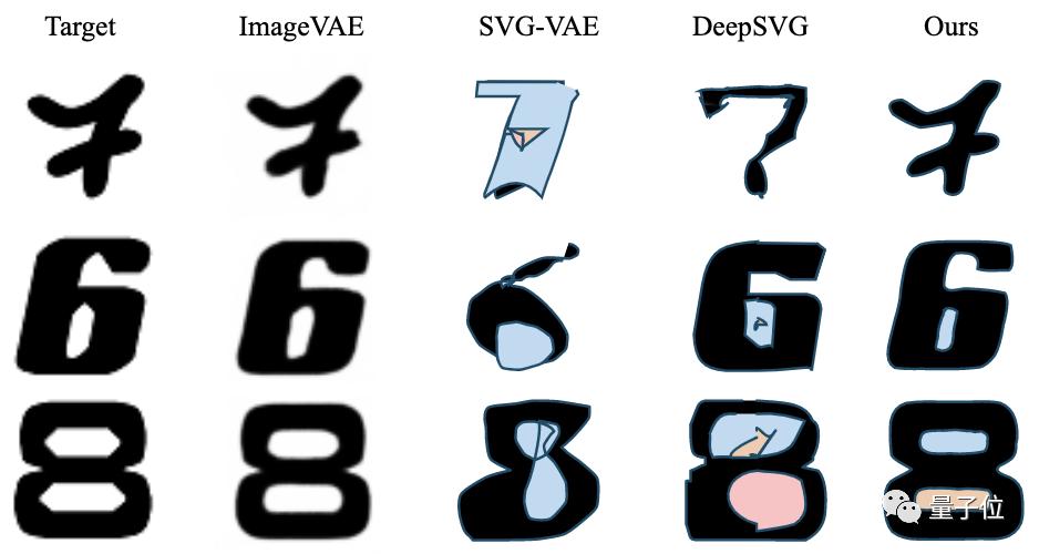 Im2Vec可以捕获复杂的拓扑结构并输出矢量图形;ImageVAE具有良好的保真度,但输出的栅格图像分辨率有限;SVG-VAE和DeepSVG能产生矢量输出,但往往不能准确再现复杂的字体。