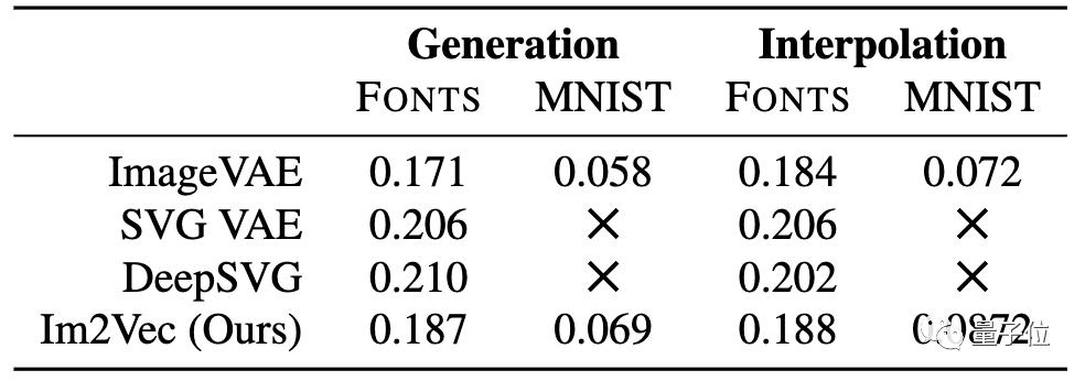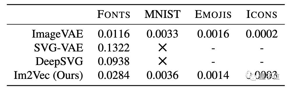 由于只有栅格数据,没有矢量图形基准,SVG-VAE和DeepSVG都不能在这个数据集上训练;