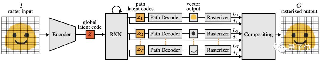 具体而言,首先要训练一个端到端的变分自动编码器,作为矢量图形解码器,用它将光栅图像编码为隐代码 z ,然后将其解码为一组有序的封闭向量路径。