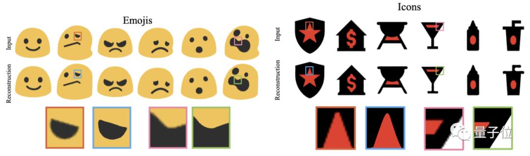在Emojis和Icons数据集测试模型的重建性能,可以看到Im2Vec模型可以在任意分辨率下进行光栅化。