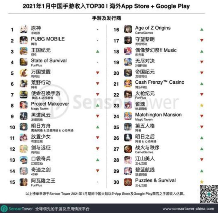 2021年1月中国手游收入榜单,图源Sensor Tower