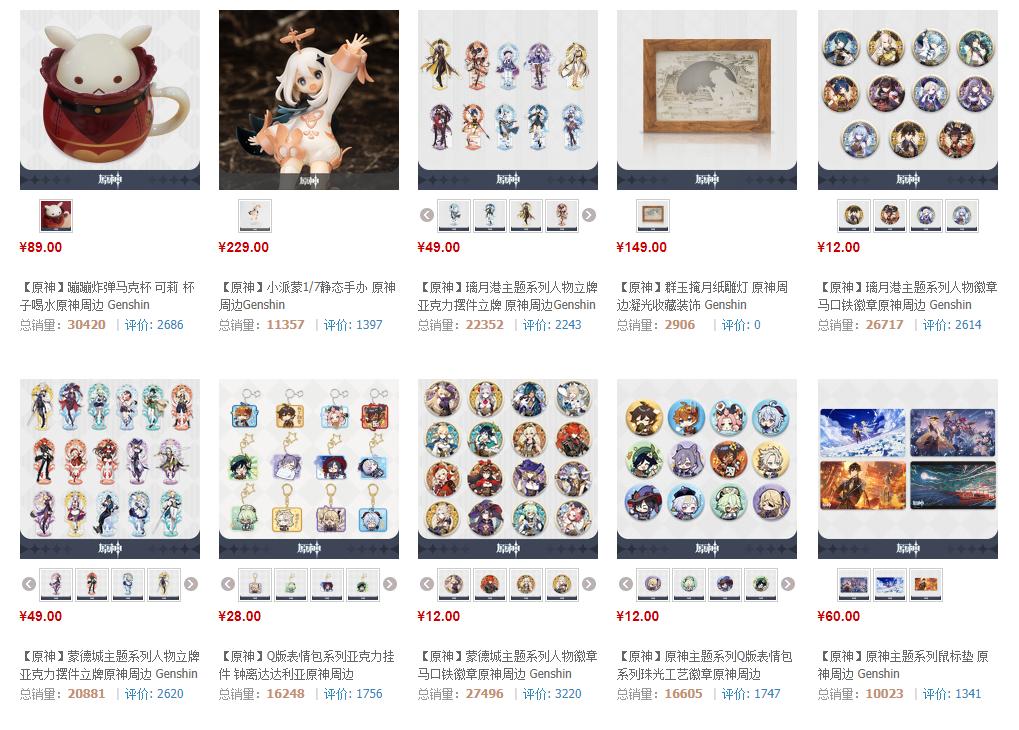 除此之外,《原神》在天猫顺势推出官方旗舰店,售卖手办、徽章、鼠标垫等各类周边产品,这些二次元产品成为不同玩家争抢的对象,也成为玩家比拼热爱的象征。