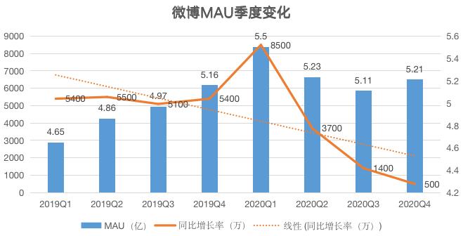 而在用户增长方面,微博同样表现乏力。2020年12月微博月活用户5.21亿,较上年同期净增约500万;平均日活用户2.25亿,较上年同期净增约300万。