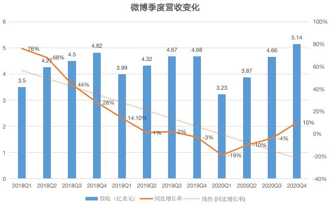 3月18日晚间,微博发布2020年Q4季度及全年财报。数据显示,微博Q4营收5.13亿美元,较前三季度有所回转,并较上年同期4.68亿增长10%。但结合全年财务数据来看,2020全年总营收仅16.9亿美元,同比下降4%。