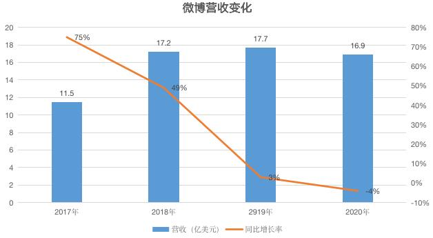 结合过往财报数据能够明显看出,微博正陷入新的增长瓶颈。连续三年营收维持在17亿美元上下,且营收增长率在逐年下降。经历了2017-2018的飞速增长后,微博营收增长率从高达75%逐渐掉入负增长,并在2020年跌至-4%。