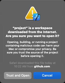 而在运行Xcode项目后,开发者唯一能收到的提示是普通的第三方下载安装警告:“project”是一个从互联网上下载的工作区。你确定要打开它吗?打开、构建或运行一个包含恶意代码的项目可能会伤害你的mac或危及你的隐私。在打开项目之前,请确保您信任它的源代码。