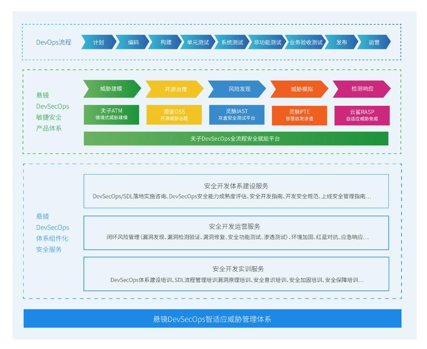 公司创始人子芽介绍,结合多年的敏捷安全落地实践经验,悬镜安全探索出了一套基于原创专利级“敏捷流程平台+关键技术工具链+组件化安全服务” 的DevSecOps智适应威胁管理体系。它作为DevSecOps全流程AI安全赋能平台,从构筑之初就注重技术落地的柔和低侵入性,从驱动DevSecOps CI/CD管道持续运转的几大关键实践点入手,通过对威胁建模、开源治理、风险发现、威胁模拟及检测响应等关键技术创新赋能政企组织现有人员,帮助甲方组织逐步构筑一套适应自身业务弹性发展、面向敏捷业务交付并引领未来架构演进的内生安全开发运营体系。