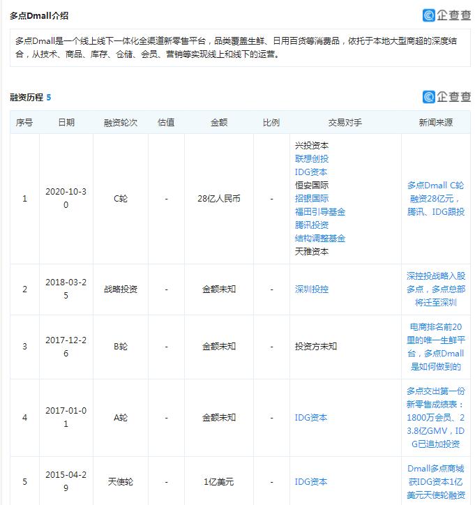 其实有关这家公司上市的消息就不断,尤其是在去年10月,多点在完成新一轮28亿元C轮融资时,市场认为本次融资就是其为2021年上市做冲刺准备。据企查查数据显示,截止目前,多点共获得五轮融资,战略投资方包括腾讯、IDG技术创业投资基金、联想创投等。