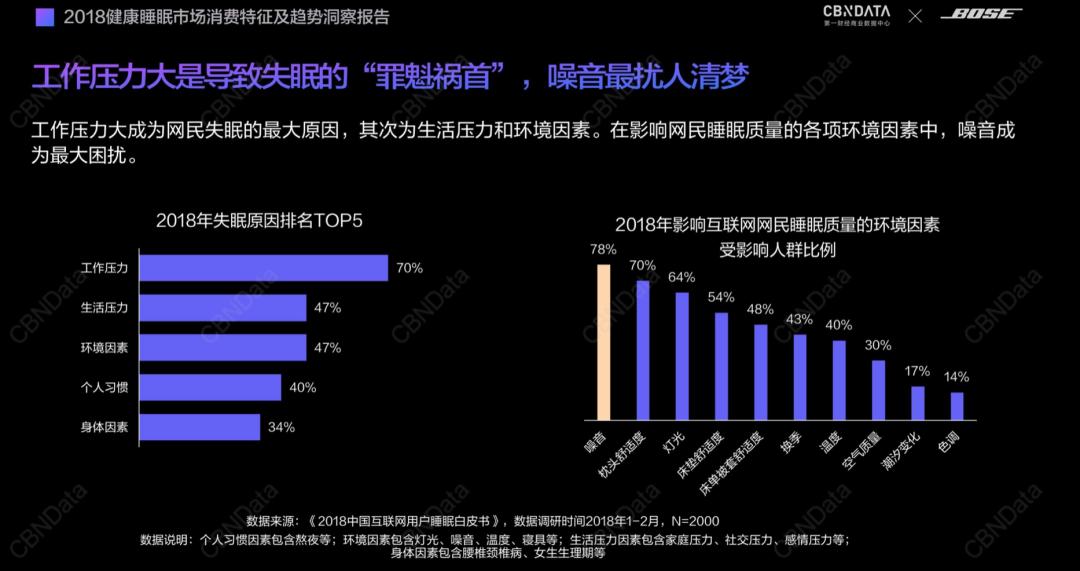 据《2018年健康睡眠市场消费特征及趋势洞察报告》显示,失眠原因TOP5主要是:工作压力、生活压力、环境因素、个人习惯及身体因素。