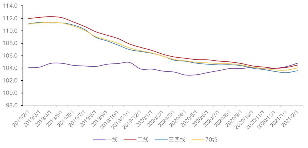 2021年前2月,全国新房销售价格呈现同比上涨趋势,涨幅趋于平稳。各能级环比涨幅有升有降,其中一线城市环比涨幅最高。具体来说,一线城市新建商品住宅销售价格环比上涨0.5%,涨幅比上月回落0.1个百分点;二线城市上涨0.4%,涨幅与上月持平;三线城市环比上涨0.3%,涨幅比上月扩大0.1个百分点。