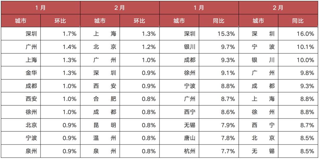 表:2021年1月、2月新房价格同环比涨幅前十城市排行