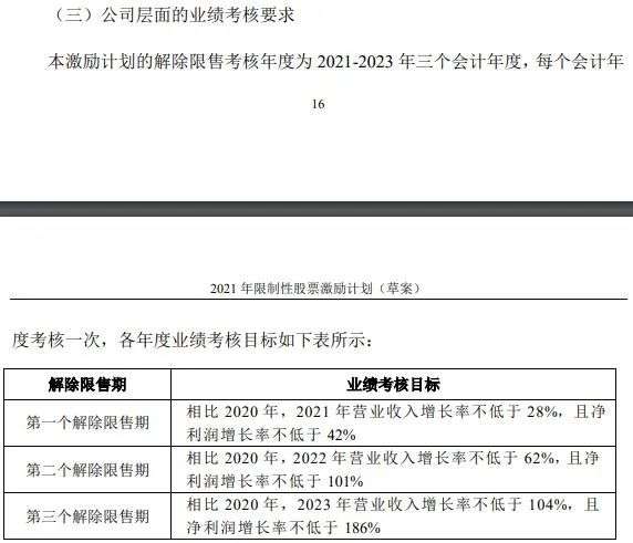 比如盐津铺子3月2日发布的股权激励,其业绩考核要求为:以2020年为基数,2021~2023年营业收入增长率分别不低于28%、62%、104%;净利润增长率分别不低于42%、101%、186%。折算成同比增长率,则净利润不低于42%、41.55%、42.29%。
