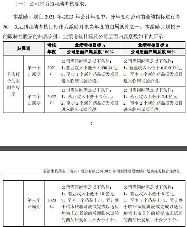 今年2月初,主营一款抗HIV创新药的科创板公司前沿生物,发布了上市后首次股权激励计划,业绩考核方案(业绩考核目标A)为2021~2023年分别实现营收8000万、3亿、10亿元,而这一业绩目标远远超出了机构对公司的预判。根据此前西南证券发布的研报显示,西南证券预计前沿生物2021~2022年的收入分别为1.1亿元、2.1亿元,即便如此,也需要公司未来2年可以实现每年的营业收入同比几乎翻倍,而要实现国内销售年收入10亿元可能要等到近10年后的2030年。