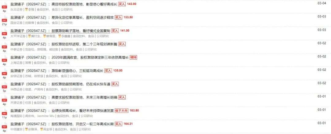 类似的情况在盐津铺子上也有出现。今年3月1日傍晚,公司公告了一则有高行权条件的股权激励计划,在3月1日~3日,公司股价连续3个交易日涨停。与此同时,今年3月以来各券商发布带有推荐性质的针对公司的研报也明显增多。据Choice数据显示,3月1日~4日,有10家券商针对公司发布了研报,其中有8家券商给出了“买入”评级,而这些券商推荐公司的缘由大多基于此次公司的股权激励计划设置的高行权条件。