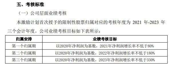 而公司层面业绩考核归属条件为2021~2023年扣除股权激励成本后归属于上市公司股东的净利润较2020年分别增长不低于80%、180%、330%。这意味着,为了要实现股权激励业绩目标,2021~2023年公司的实际业绩增速需要更高,这无疑增加了公司完成业绩目标的难度。