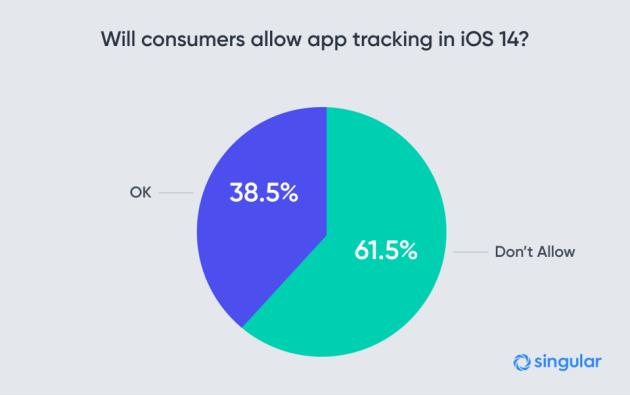 国外营销分析与归因平台Singular最近调查了600名iPhone用户,近40%的用户将会允许APP获取个人信息,60%以上用户不会同意。全球范围内广告的个性化能力将下降44%。