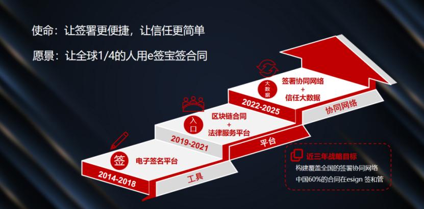 后来我们把这份初心更清晰地概括成了e签宝的使命和愿景:使命是“让签署更便捷,让信任更简单”,愿景是“让全球四分之一的人用e签宝签合同”。使命愿景往往是一家企业用来指明方向的,但我觉得它更重要的是所有定力的出发点。当公司面临两难的取舍的时候,最终还是回到使命愿景。