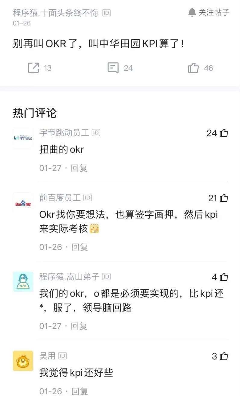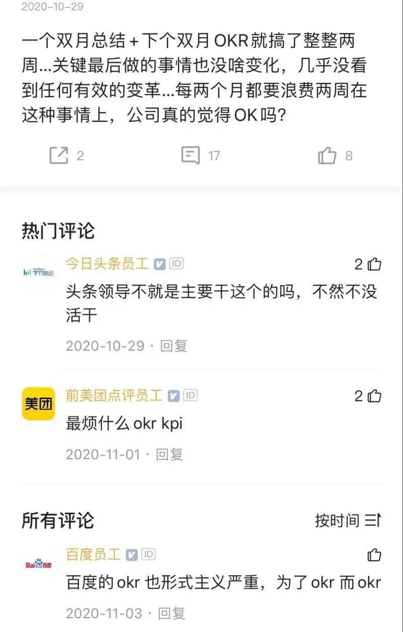 在脉脉等互联网的“职言”社群里,OKR是一个能够让互联网人搁置争议,同仇敌忾的话题。“变形的KPI”,“中华田园KPI”,都是高频出现的评论。