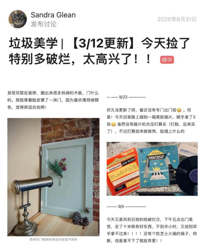 在小组里,你还能看见“拾荒艺术家”们认真地记录每一个“风和日丽的捡破烂儿日”,捡到了“好破烂”,和友邻分享时都要多个感叹号表达喜悦。