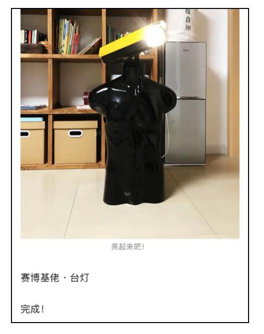 商场拆迁工地上捡到监控摄像头和废旧模特架,组装涂漆,变成“赛博台灯”。